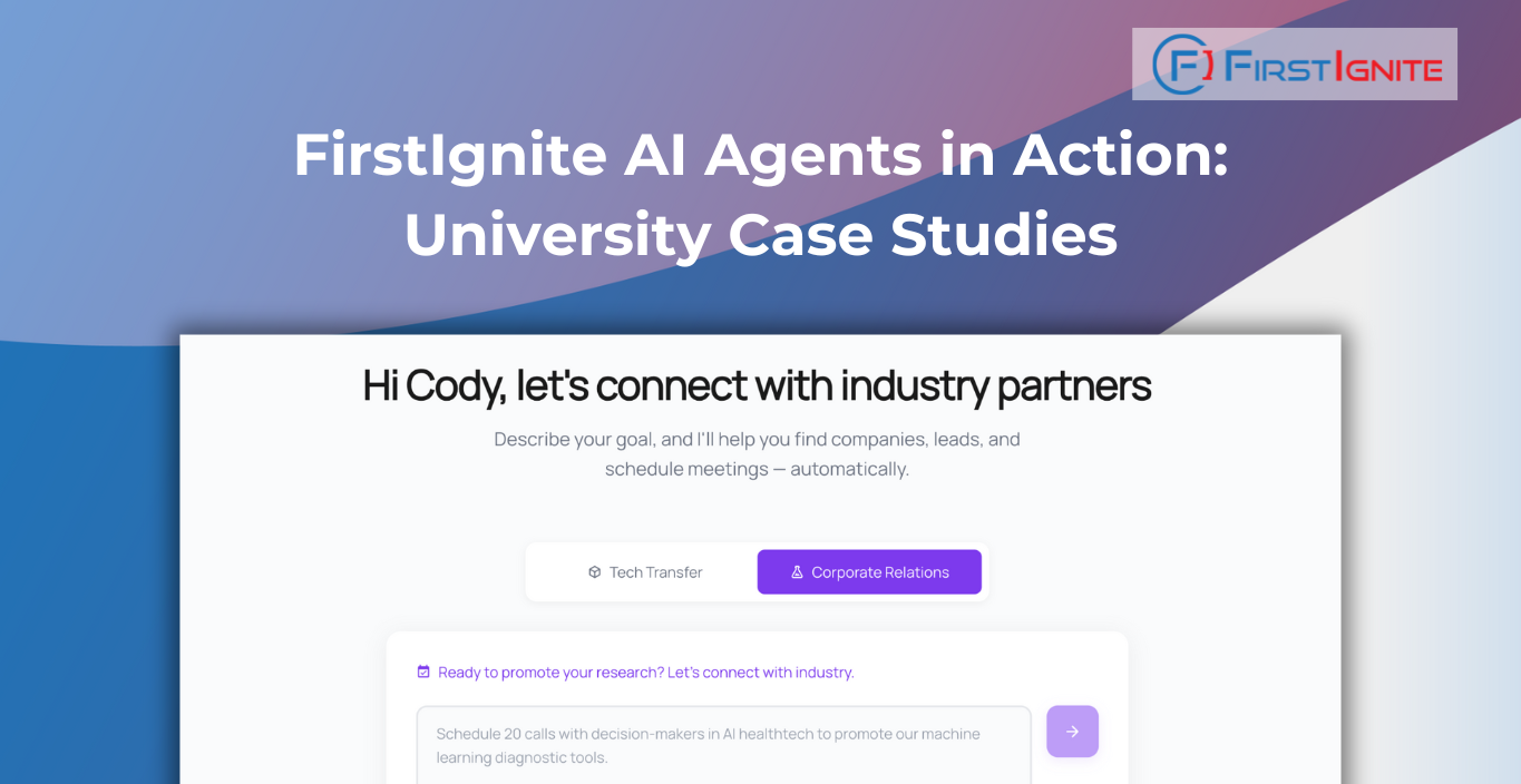 The University of Arizona wanted to accelerate the commercialization of a new patent by connecting with relevant industry players. Instead of tasking staff with manual prospecting, they deployed a FirstIgnite AI Agent.