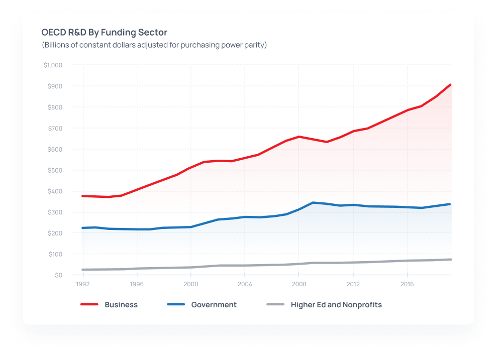 The OECD (Organisation for Cooperation and Development), comprising 38 countries, has seen an astounding increase in all R&D funding sectors, but especially from companies. FirstIgnite can help your university form global partnerships with companies that can supercharge your research funding and commercial output.